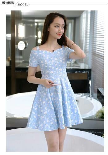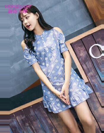 镜子里的人儿映出一名身材玲珑有致的少女,身穿蓝色露肩短裙腰间系着蓝色缎绳,裙子则在膝处像蝶翼般延展开来