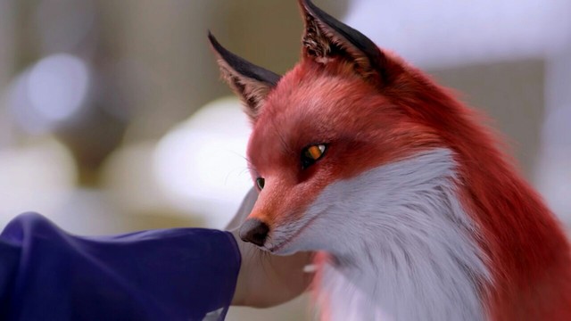 这时白衣男子走了进来,见狐狸醒了显得有些高兴;月兮歪着头看着他,倒显得呆萌呆萌的!男子蹲下来摸摸月兮的头。