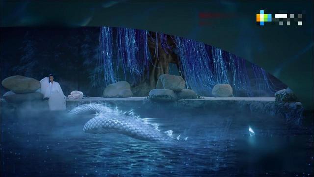 水面上闪闪发光,还不时的会有星星坠入其中。仔细一看水中还有一条尾巴,好像是龙的尾巴,上面的鳞片在夜光的照耀下闪烁着光芒。