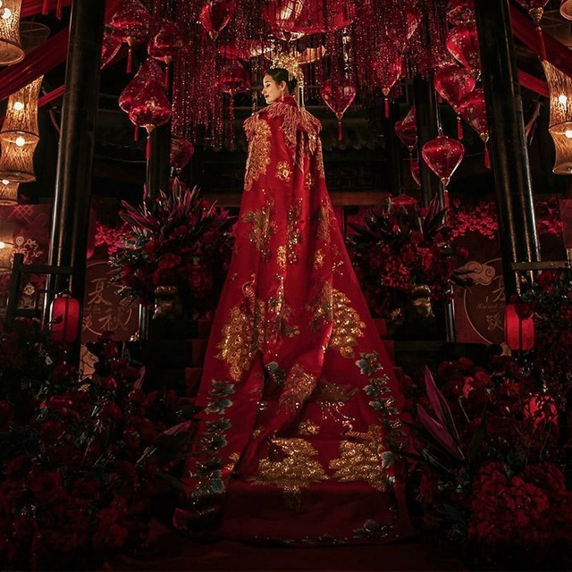 红色的婚服就像是古时的皇后穿的衣服,虽然上面没有那么多繁琐的凤凰花纹,但是用金丝线编织的花纹尊贵却不俗。