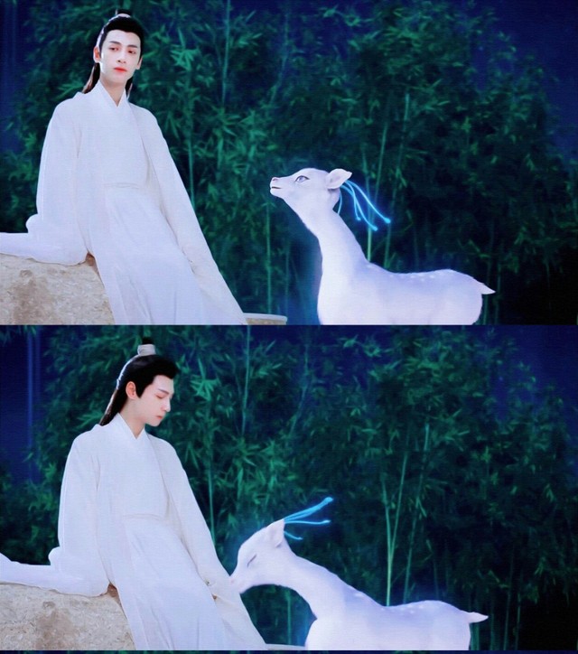 润玉坐在彩虹桥旁的石头上,魇兽走过来蹭了蹭他的衣袖,润玉低头望向它。