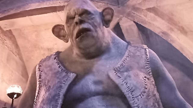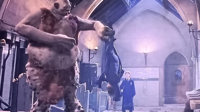 此时好像激怒巨怪,巨怪把哈利抓起来,拿棍子打他