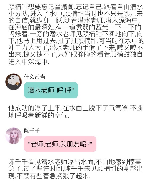 顾楠甜游上岸,听见一个女孩哭泣喊叫的声音,突然之间,岸上的陈千千看到了顾楠甜,她立马跑到游艇旁边,不顾危险,弯下身子去拉顾楠甜,潜水老师看到了也立马一起去帮着把顾楠甜拉了上来,而她因为初到蓝星,而且进入了一个比较柔弱的蓝星人体内,她有些支撑不下去了,晕了过去……