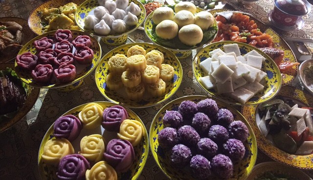 又是重复的工作,剥橙子—碾碎—和面—混合加水—加糖—成泥,这次糖少点。完工,上蒸屉。然后又是烧火难关,再苦再累,坚持就好