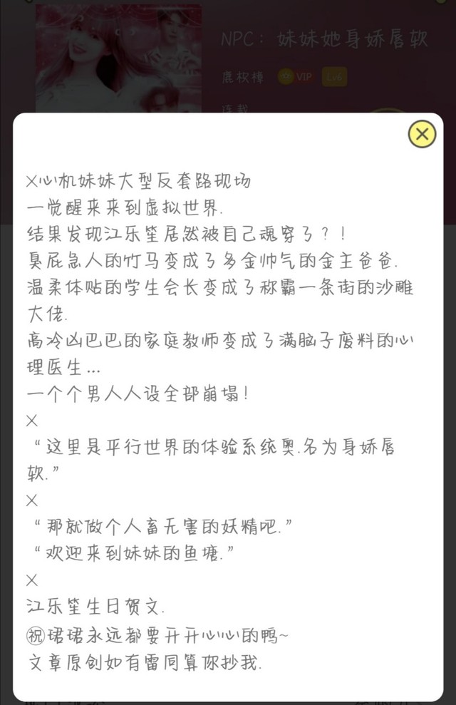 智障姐“久等了!文隔天更!多多支持新文《NPC:妹妹她身娇唇软》是参加话本比赛的文!需要各位的支持!”