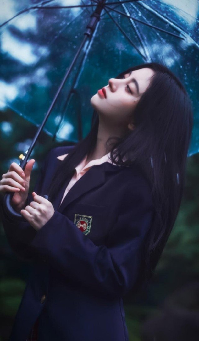 徐雯雯这张是在今天拍的,今天不是下了大雨吗?她就撑着这把透明的伞和她的好朋友回家了。