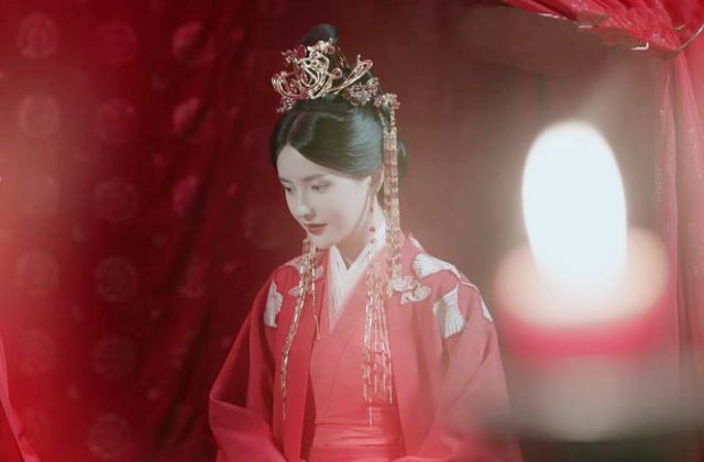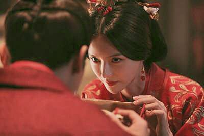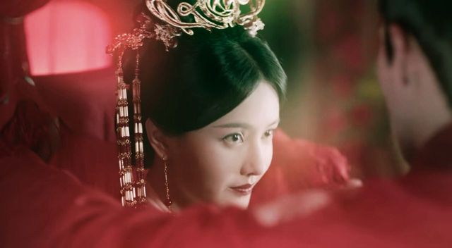 她朱唇绛脂匀,因为有些许的羞涩略施粉黛的脸颊泛起了红晕,低着头有些不敢看他,凤披霞冠,衬得她更加娇媚动人.