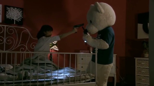 忽然,邓警官睁开眼睛迅速从枕头底下拿出枪,指着人偶熊