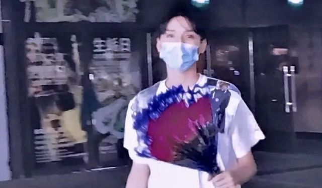 听到背后急促的脚步声我下意识转头 看到他手捧玫瑰花朝我奔来