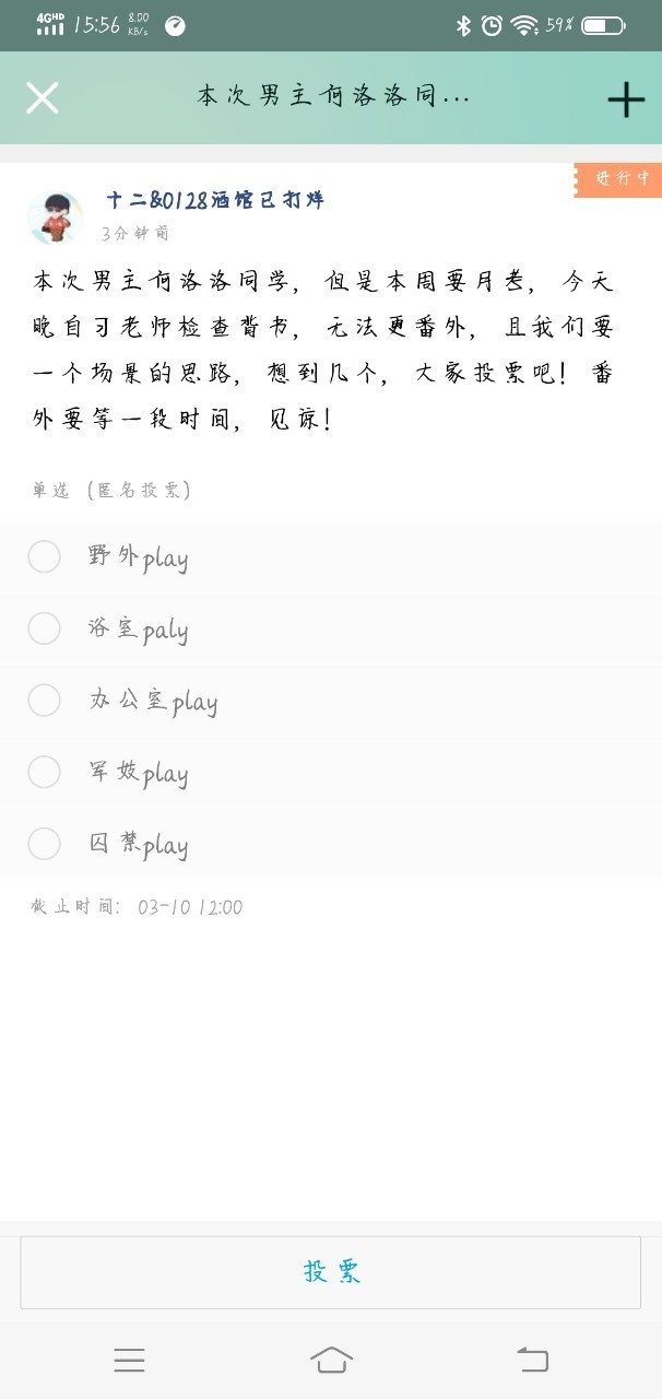 沙雕大大男主何洛洛,因为没啥思路,再来个场景的投票,番外需要等一点时间,投票进群呀!