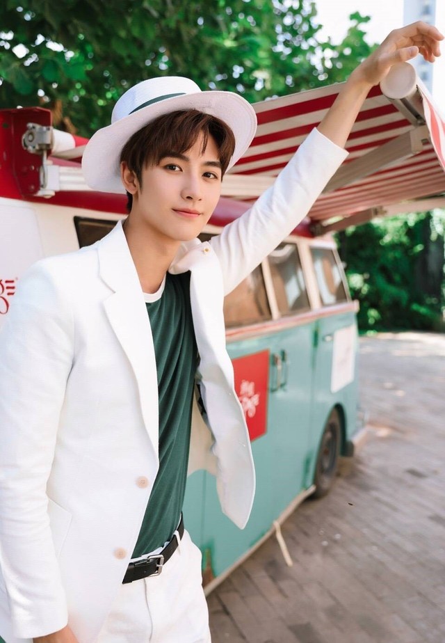 也许是因为要见家长,他并未穿的像上次那般隆重,只是穿了件墨色的T恤,外面加白色西服套装,头上还顶着一定白色遮阳帽。与他平日里的高贵奢华一点也不搭。