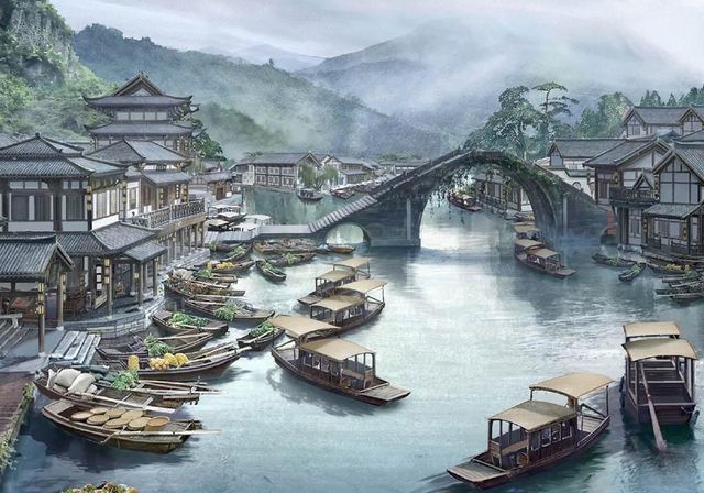 这里依山傍水,小城里面交织着密布的河网,密密麻麻的水路旁边是红墙灰瓦的民居。各种豆茶丝绵,花卉蔬果都在河两边叫卖好不热闹。