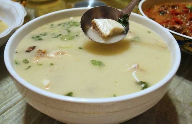 第一道菜是黑鱼汤。这黑鱼汤烧制颇有讲究,需取白荡湖中新鲜的黑鱼,要两斤重一条,扒皮,去骨,用快刀削成薄片。先用猪油滚锅,再取鱼头、鱼骨、鱼皮用瓦汶,取大青山龙溪深谷的溪涧清水熬汤,熬上三个小时后,再取鲜美汤汁,用铁锅烧沸腾,黑鱼片用淀粉勾芡,下锅。五分钟后起锅,再在汤上洒下枸杞、葱花。做成的黑鱼汤鲜美,鱼片爽口。