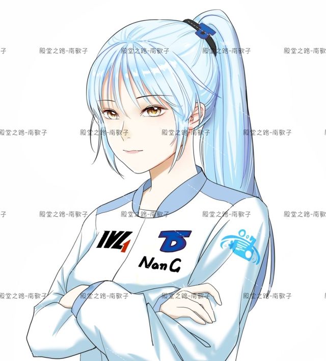 DT的队徽改了颜色,夺目的金变成了沉稳的蓝,南歌子的选手ID,NanG正印在队徽下方,DT的队服十分简约,白底蓝框,袖子上印着DT战队的赞助商“瀚海直播”的logo,南歌子在拍定妆照之前还染了冰蓝色的头发,再捆上DT的周边发绳,活脱脱就是个队标代言人。