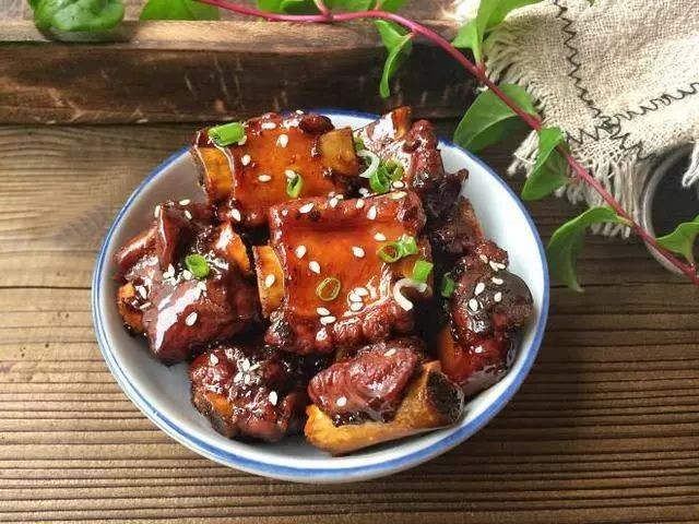 肋排焯水后煮30分钟,捞出后用一汤匙料酒、一汤匙生抽腌制二十分钟。捞出肋排洗净控水,锅内放排骨和腌排骨的水。加入白糖,小火焖十分钟后收汁,放入香醋,出锅后撒葱花酱料少许味精即可。