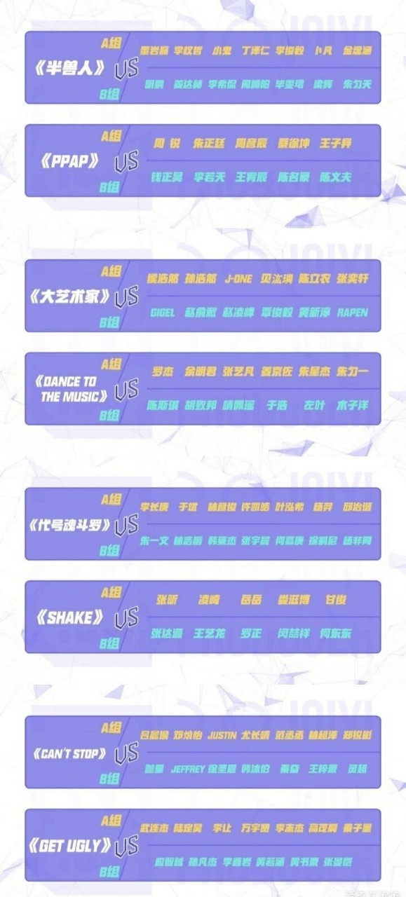 张艺兴以上就是小组对决的八个对决曲目。那么接下来我们来进行选歌组队。在这里还是要提醒大家,在你们做选择的时候,一定要慎重考虑。因为这次公演之后将要淘汰近一半的人。