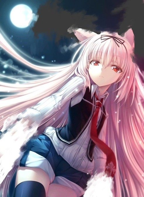 银色的长发,巨大白色猫爪。双手散发着红色魔气,染了银发,眼瞳赤红带着高冷杀意。