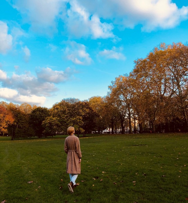 此时的他好像正在拍写真,染着亚麻黄的发色,穿着橘黄的外套,和整个枫叶林异常的融洽。