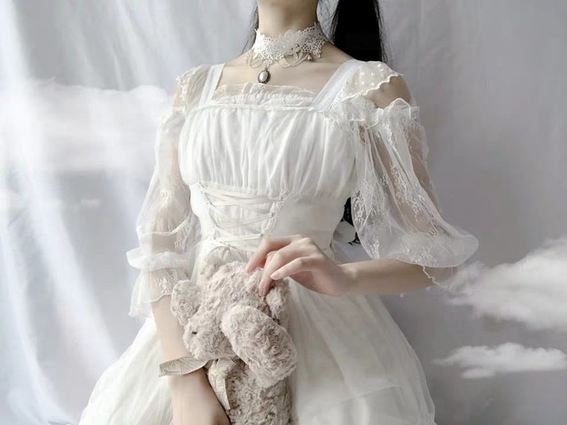 【十月繁星】烫金罩纱lolita连衣裙,裙身用束腰长绳勒出纤细的腰肢,加上纯白锁骨链,手里的玩偶,像是为女孩量身定做的一件衣服一般,场景越入美好