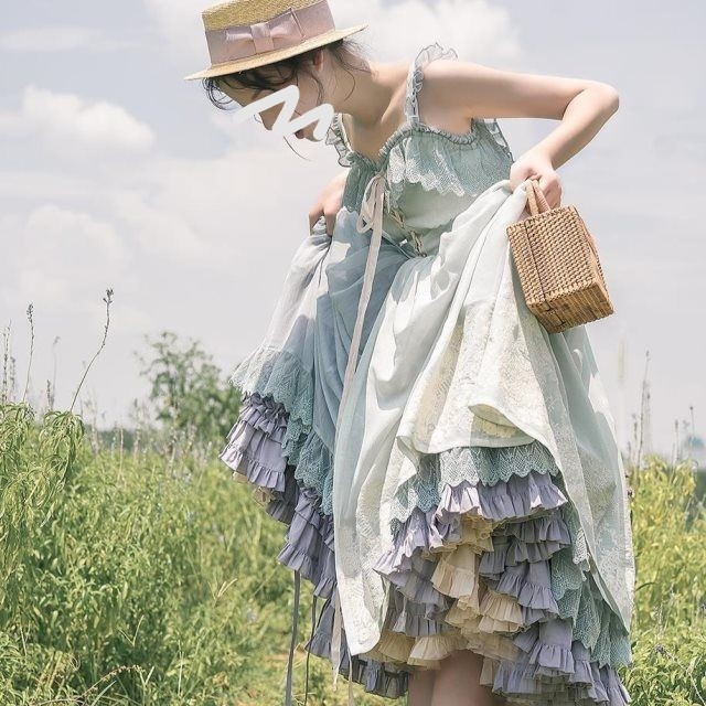 女孩提起裙摆,手拿着小篮子,头戴一顶田园帽,看着地下的东西