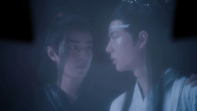 魏无羡一回头,发现你们站在了屋子门口,魏无羡立马跑了过来,拉住蓝湛。