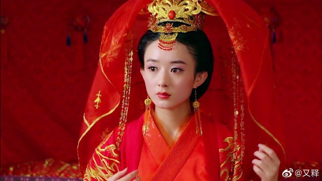 青瑶一身新娘红衣妆,婚纱上搭配流苏、荷叶边,手工细绳结,刺绣和珠串点缀,穿在身上,美轮美奂。