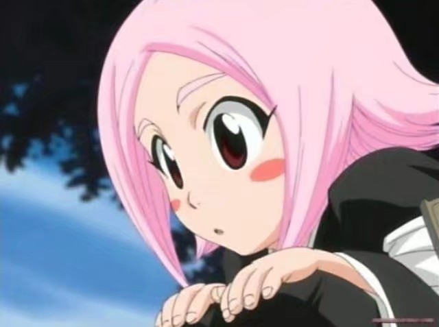 就在这时,一个身着死霸装,有着粉色短发和可爱红晕的小萝莉从天而降落到更木剑八背上,她便是更木剑八的副队长草木八千流。