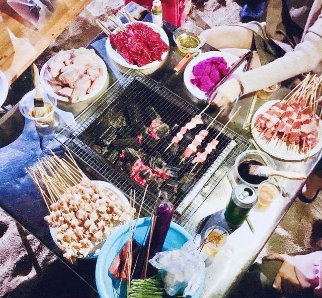 这边的烧烤摊还是依旧的热闹非凡,星火四射