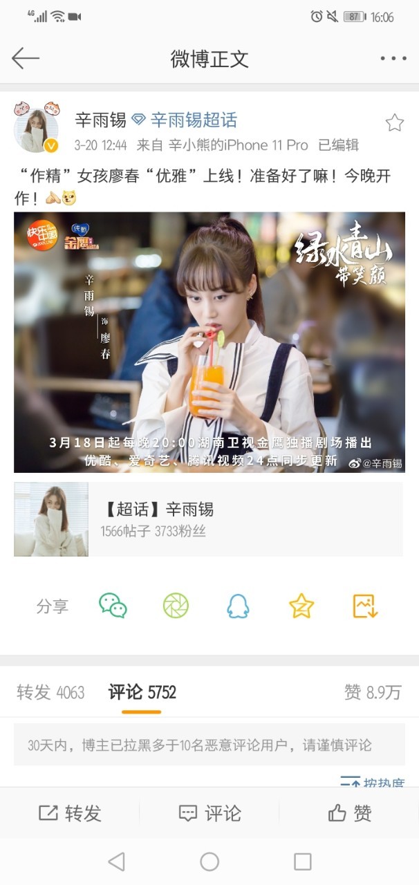 《绿水青山带笑颜》嗯…有时间一定要看看,听说在这部戏里辛雨锡饰演的角色会有点恨人,所以率先开启“自黑模式”,不得不说,这个女孩还是很可爱的啊。