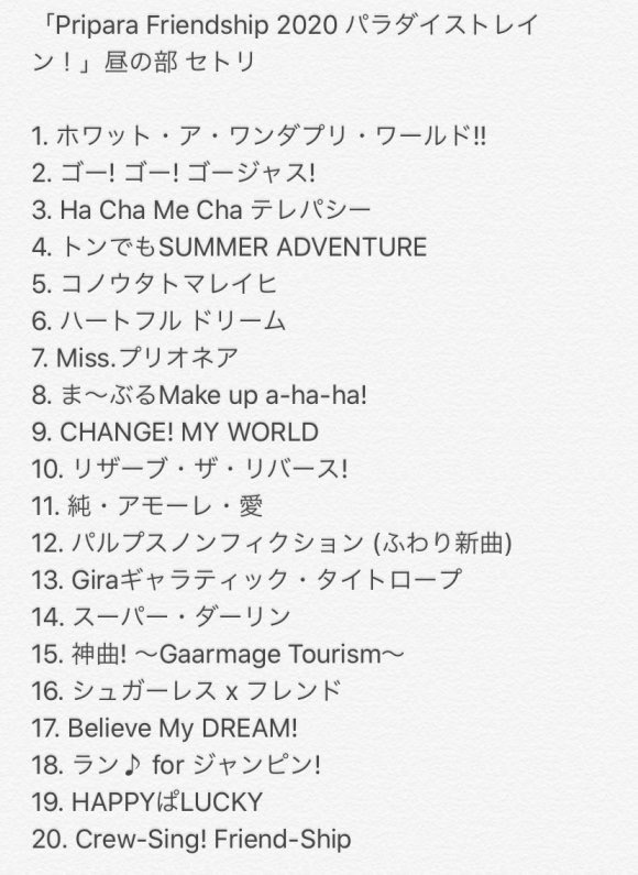 そして、そして、"プリパラフレンドシップ二零二零年パラダイストレイン!"昼の部セトリを紹介は:
