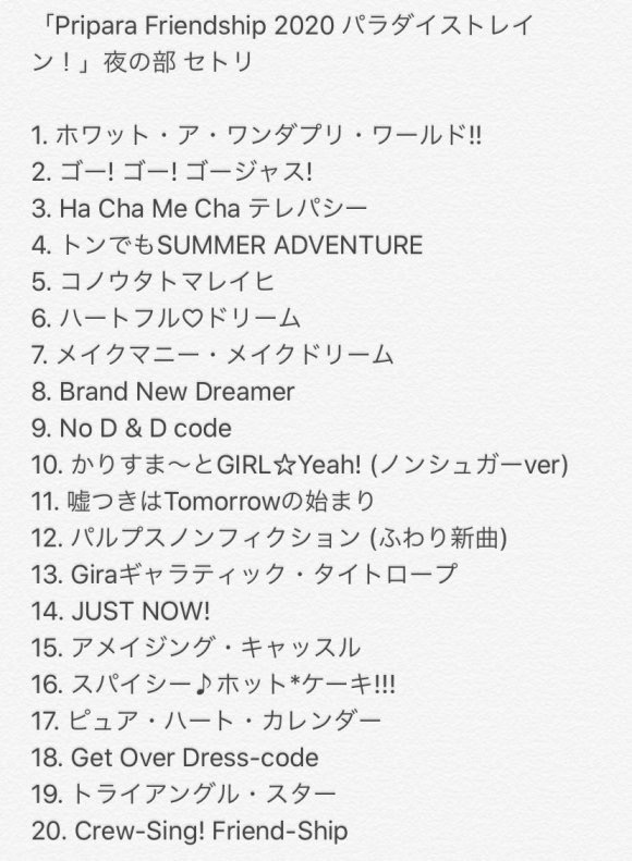 "プリパラフレンドシップ二零二零年パラダイストレイン!"夜の部セトリを紹介は: