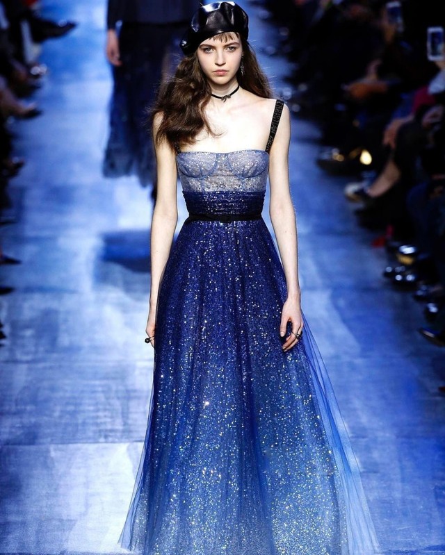 温柔的蓝色渐变吊带长裙,裙摆上缀满点点银色亮片,远处看去,整个人都在闪闪发亮,就像星空中的繁星一样,闪耀迷人。
