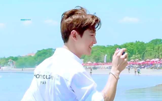远处金黄色的沙滩上的朴灿烈,一身小清新的装扮......