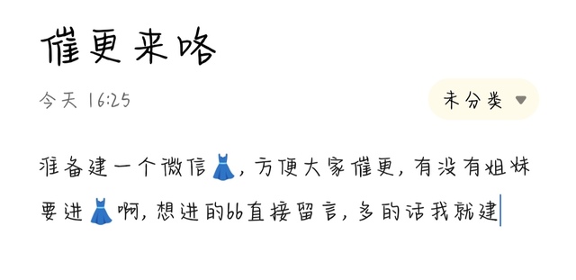 想催更的bb留言,人多的话我们就建,然后大家日常来给我催更和聊天