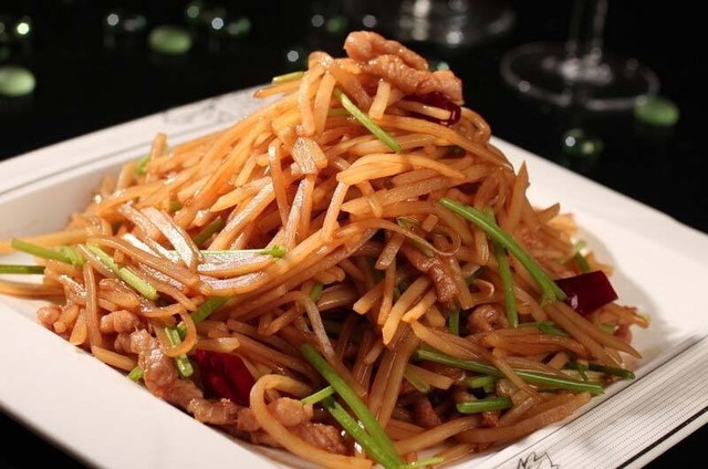 LMYS翊節锅倒入油烧热,放入肉丝,爆香葱段,再放入切好的土豆丝、胡萝卜拌炒,加入盐、鸡精、酱油翻炒均匀即可。
