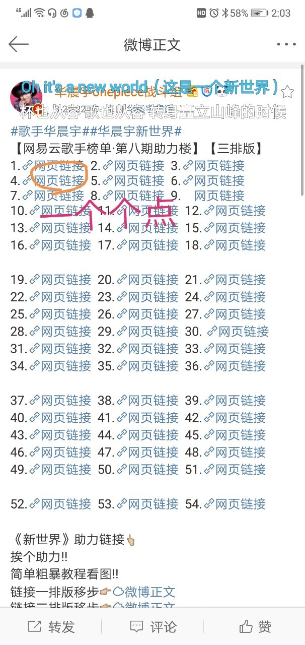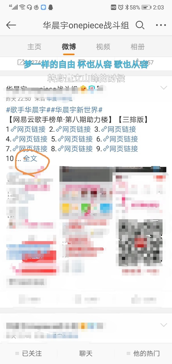 7、进入微博,搜索华晨宇onepiece战斗组,翻找他的微博,每天都会有54个链接整理出来