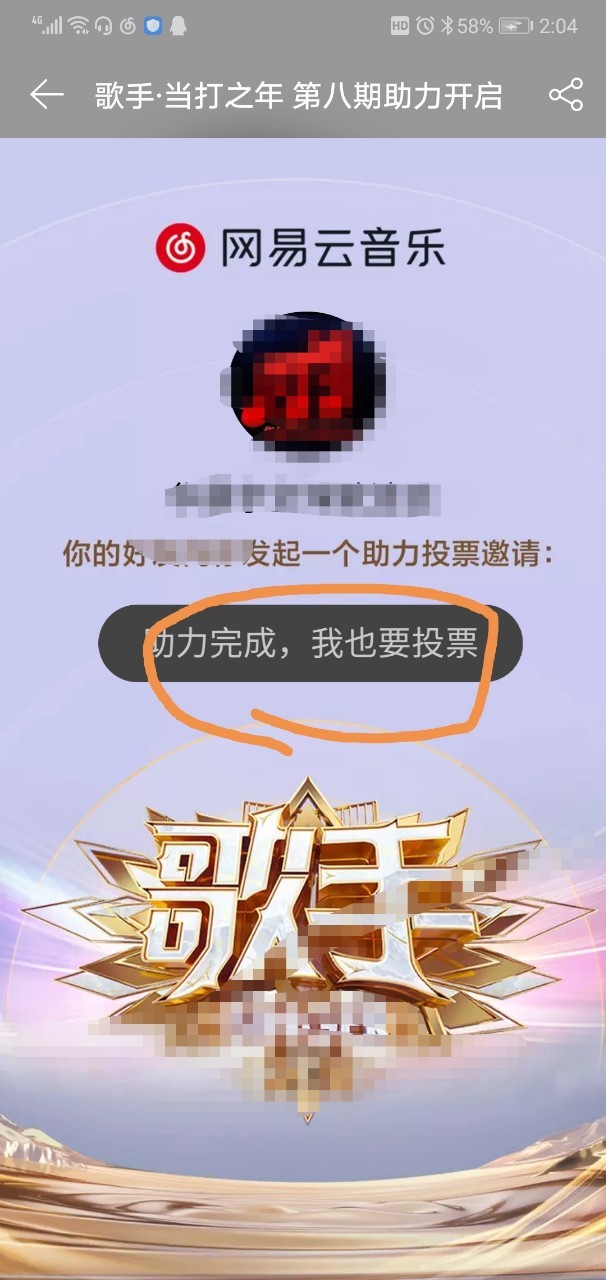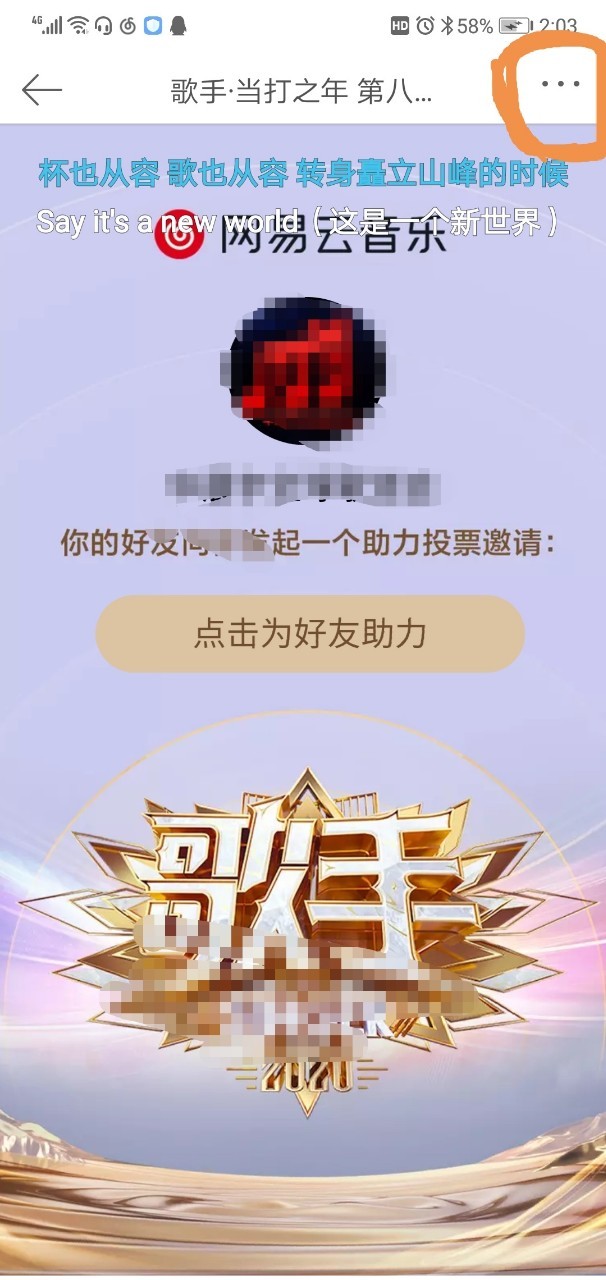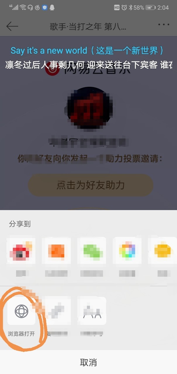 8、每人每天还有50次助力机会,一一点击链接,点右上角三个点,点击浏览器,选择网易云音乐,它就会自动跳到助力界面,点击助力,会显示助力成功,之后便会有“我也要投票”的按钮(是灰的),点击,便会有投票界面,即可再投票。(具体见下列图片,因为话本不能放视频)