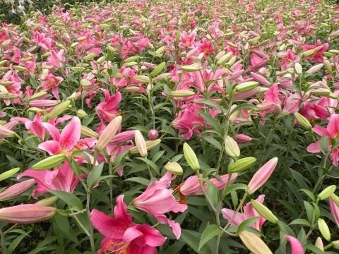 只见有一大片的粉红色百合花在树林之中