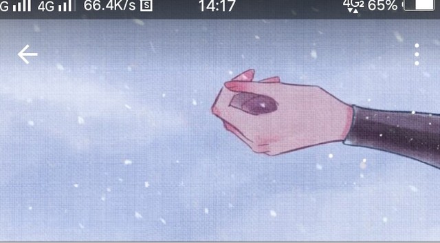 她的脸上带着面具,右手上还拿着一把刀,左手朝外伸去,试图抓住雪花