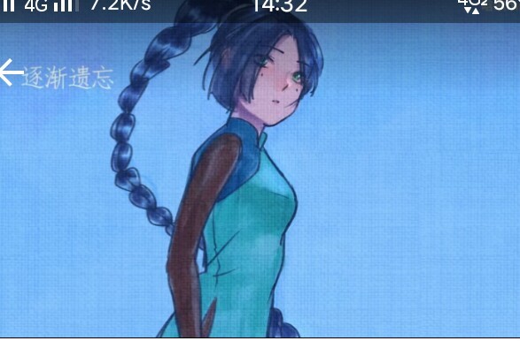 在森林里,有一身穿青衣,一头蓝色的头发,还绑着马尾辫的背影