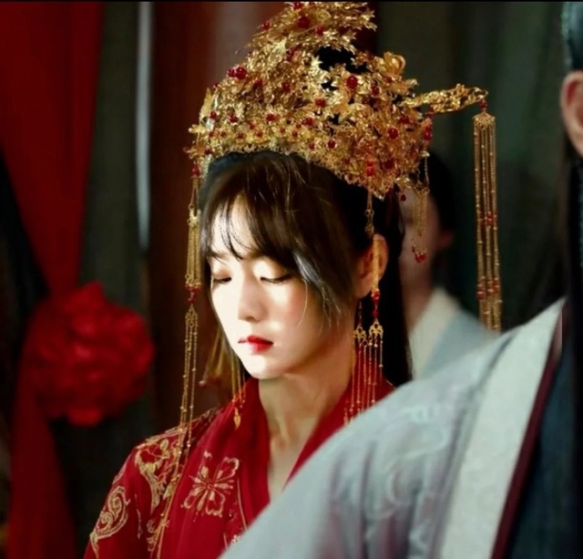 转头的时候听见珠宝饰品碰撞的声音,低头一看,自己正身着一身华贵无比的红嫁衣。