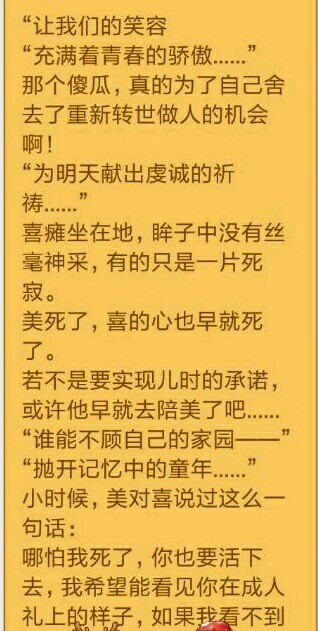 “什么?!美你什么意思!!”喜被美的这一句话吓得不轻,发疯般地一把抓住美的香肩,大吼道,“什么叫你的最终归宿啊!你说啊!”