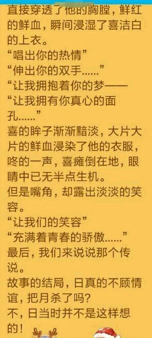 “什么?”喜浑身颤抖着,目瞪口呆地重复着死神说的话,浑浊的眼泪,犹如断了线的珍珠一般不受控制的往下流淌。