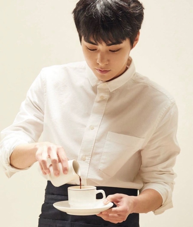 他带你去了吧台,你落座后,他则系上了围裙,洗了洗手,为你做起了咖啡,你则是观摩着金珉锡做咖啡的全过程。