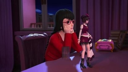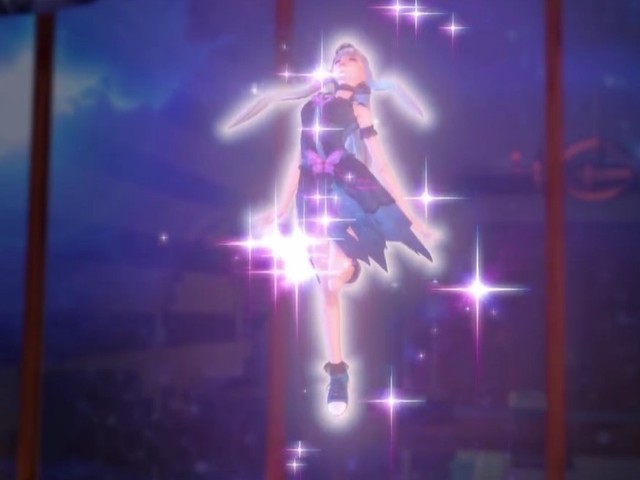 白光莹的发色和衣着都变了,银白和浅粉相间的发色,束成两条双马尾,泛着浅浅的光泽;衣裙呈深蓝色,有一层薄薄的黑色蕾丝,胸间和腰间分别有一小一大两只紫色蝴蝶,精致时尚;头戴黑色小王冠,深色的板鞋显得青春而有活力。
