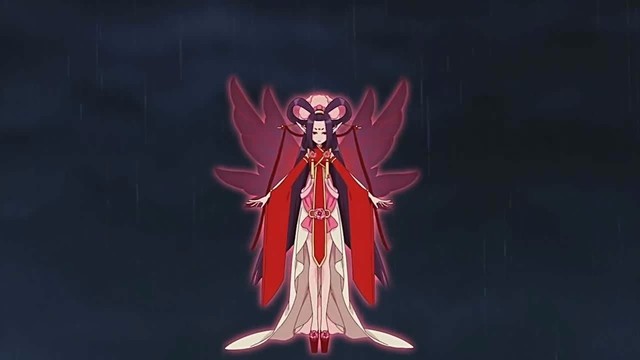伊瞳长出了浅粉色的花仙翅膀,头饰出现了黄色爱心的蝴蝶结,裙摆带着淡粉色的薄纱,粉白色的礼服上,带有许多蝴蝶结的装饰