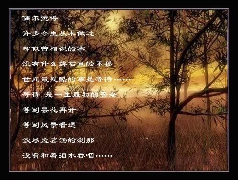 偶尔觉得,许多今生从未做过,却似曾相识的事,没有什么磐石,真的不移,世间最残酷的事是等待,等待是一生最初的苍老,等到昙花再开,等到风景看透,饮尽孟婆汤的刹那,没有和着泪水吞咽