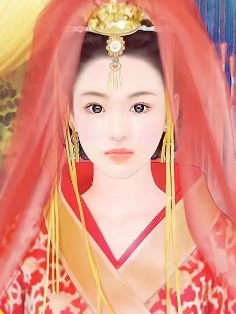 她身上穿着大红的嫁衣,孔雀金丝织就的凤冠霞帔金碧璀璨,在阳光下折射出异彩的光芒。