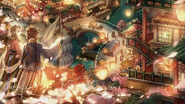 街上是一片繁华的样子,灯光闪闪,碧水绕着长安直通城门。