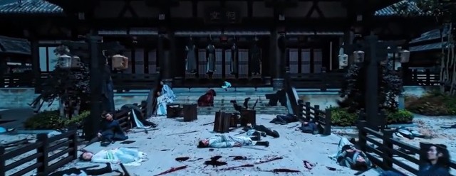 魏无羡施法将门打开,门一打开就出现三个女子被挂在柱子上,嘴里流着血,远远望去血流成河,常氏十几人口就这样惨遭灭门。